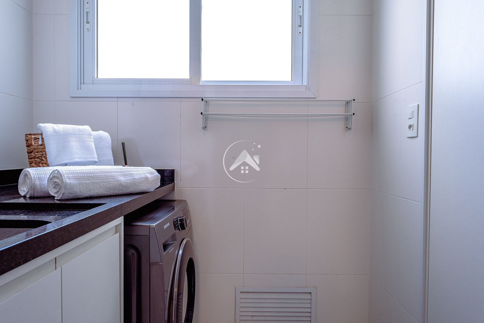 A cozinha conta com utensílios para cozinhar e servir, além dos eletrodomésticos necessários para uma estadia prática, como lava louças, máquina Dolce Gusto, filtro de água, sanduicheira, liquidificador, forno e micro-ondas. Na lavanderia há máquina lava e seca, varal, tábua de passar e ferro.