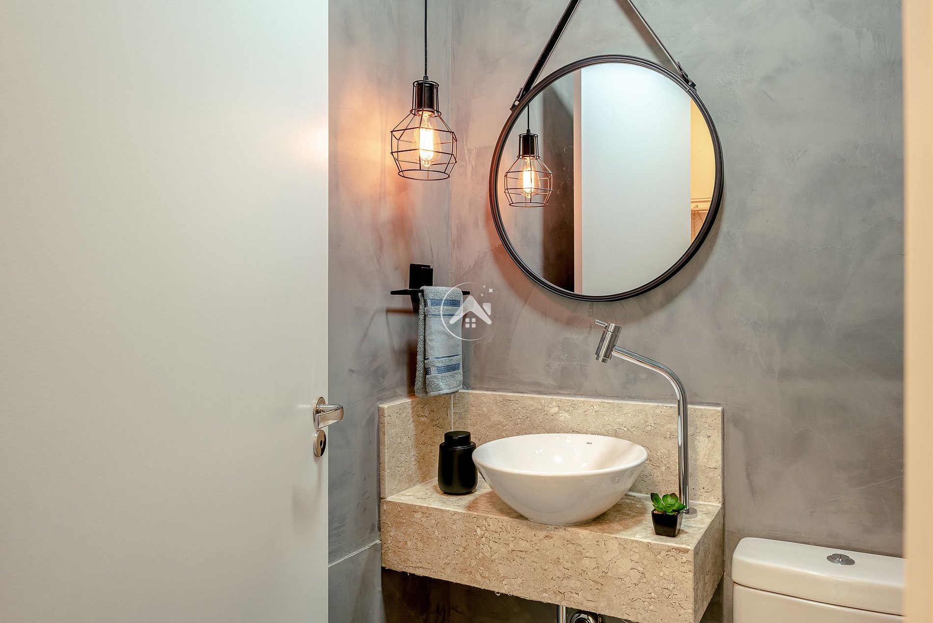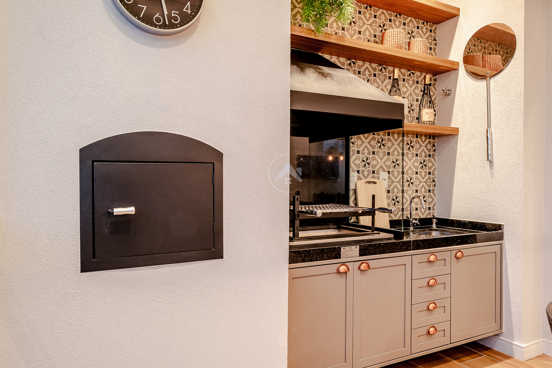 A sala de TV, localizada no piso térreo, é totalmente integrada à cozinha, canto do café e varanda gourmet, com churrasqueira e forno de pizza. Um incrível ambiente para reunir todos e apreciar momentos de descanso e diversão, assim como uma deliciosa refeição.