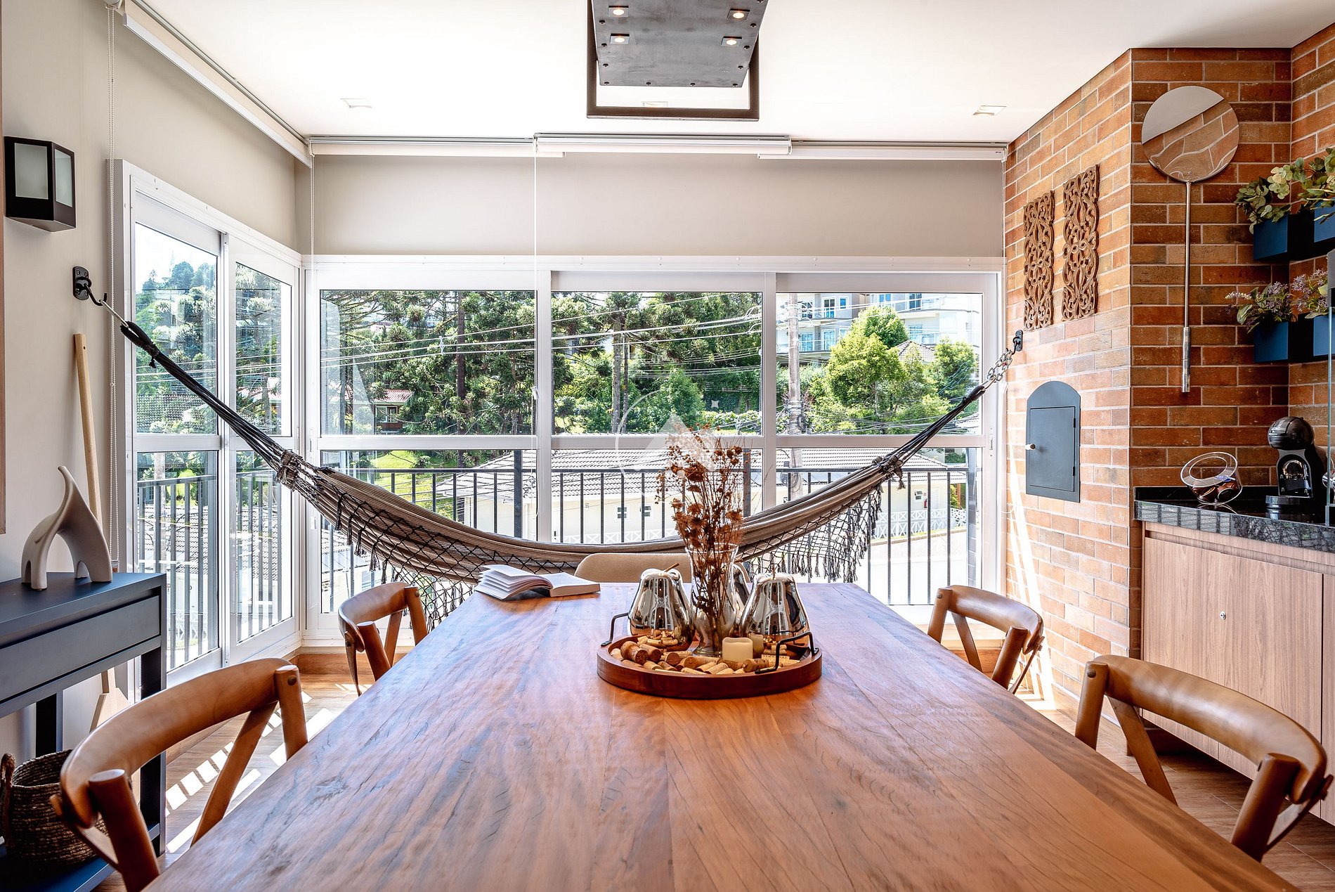 O ambiente ideal para tomar um delicioso café da manhã ou desfrutar de uma refeição em família ao redor da mesa. A churrasqueira e o forno de pizza tornam a estadia ainda mais completa. E, depois de se deliciar, a rede e o puff são ideais para o momento de sossego e descanso observando a paisagem.