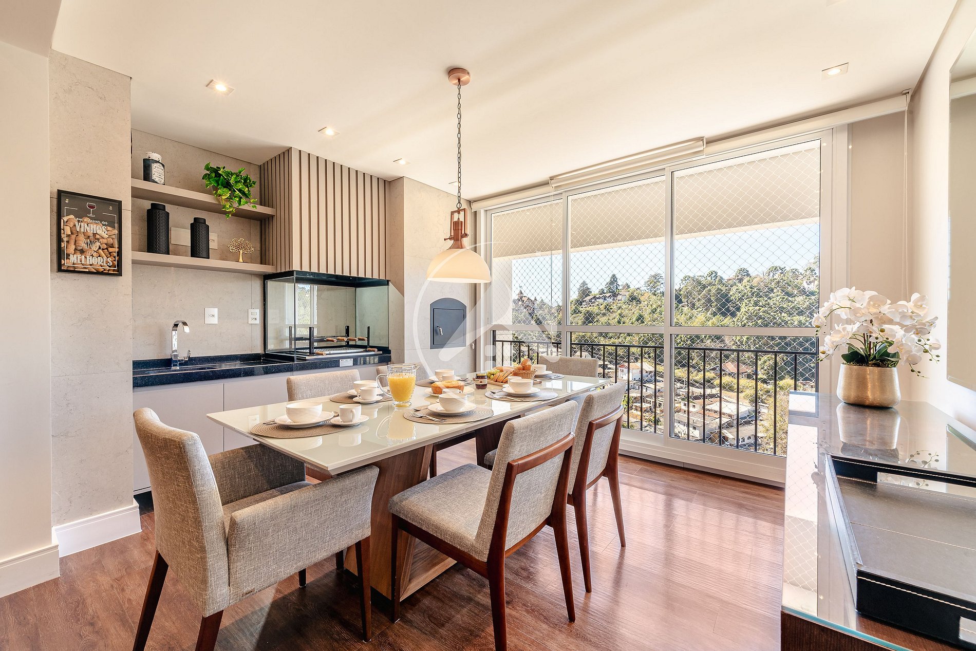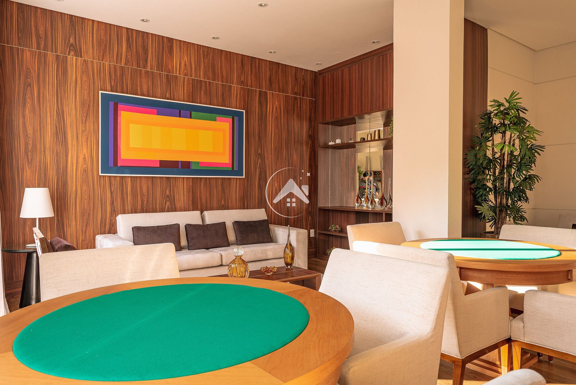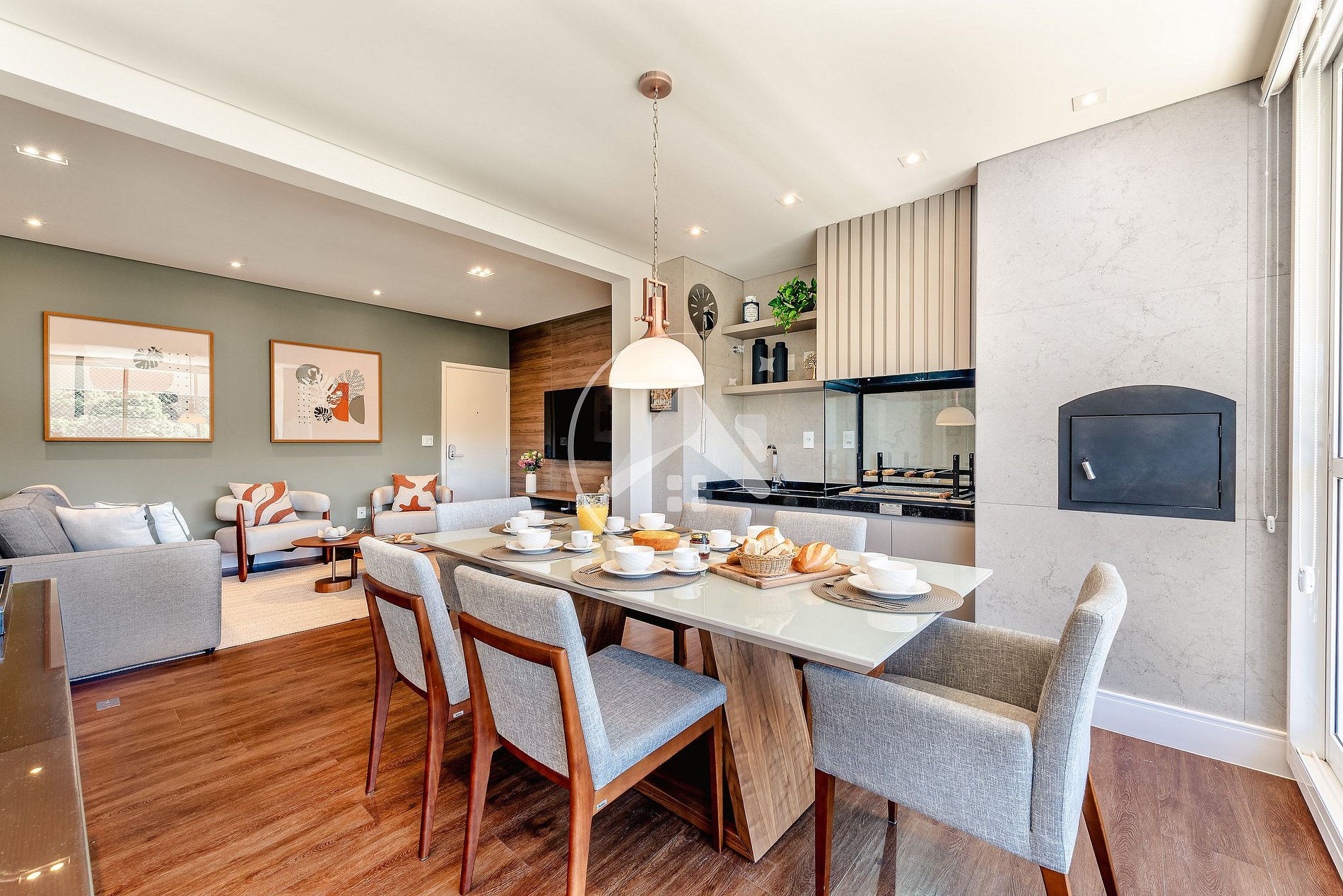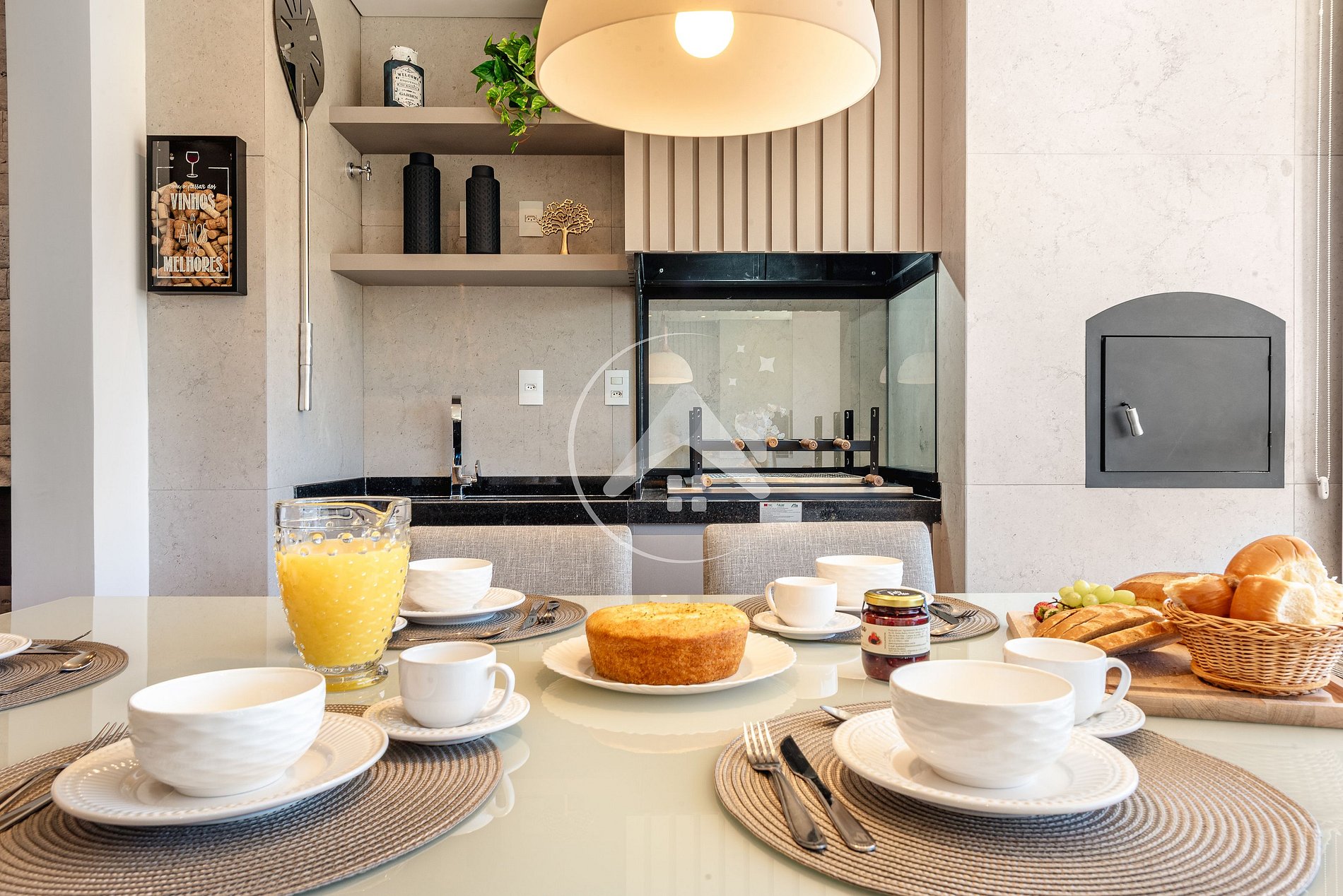 Ampla sala de TV com lareira, perfeita para relaxar nos dias frios. Integrada à área de refeições, conta ainda com churrasqueira e forno de pizza. Proporcionando um ambiente acolhedor e completo para reunir todos em torno de boas conversas e deliciosas refeições em família.