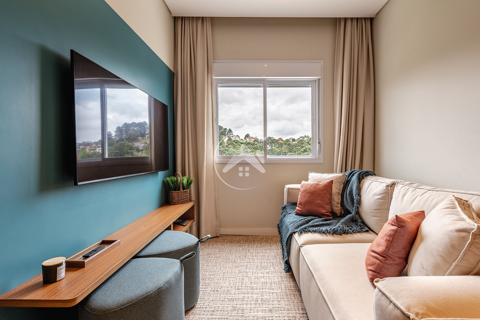 A sala de TV, confortável e prática, possui um sofá retrátil e a possibilidade de fechamento, garantindo maior privacidade quando desejado. Além disso, há um espaço dedicado ao café, com máquina Dolce Gusto, perfeito para iniciar o dia com uma bebida quente. O ambiente conta com calefação, assegurando temperatura agradável.