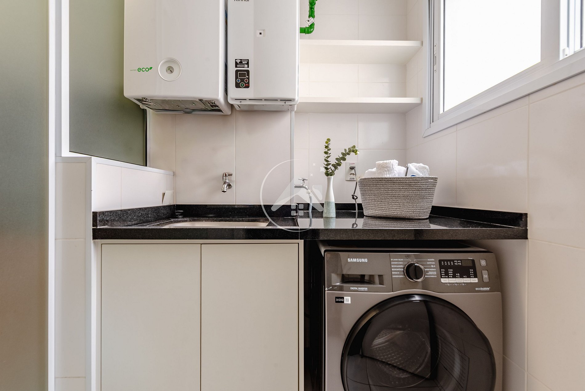 Integrada à cozinha está a lavanderia, que dispõe de máquina lava e seca, varal, tábua de passar e ferro.