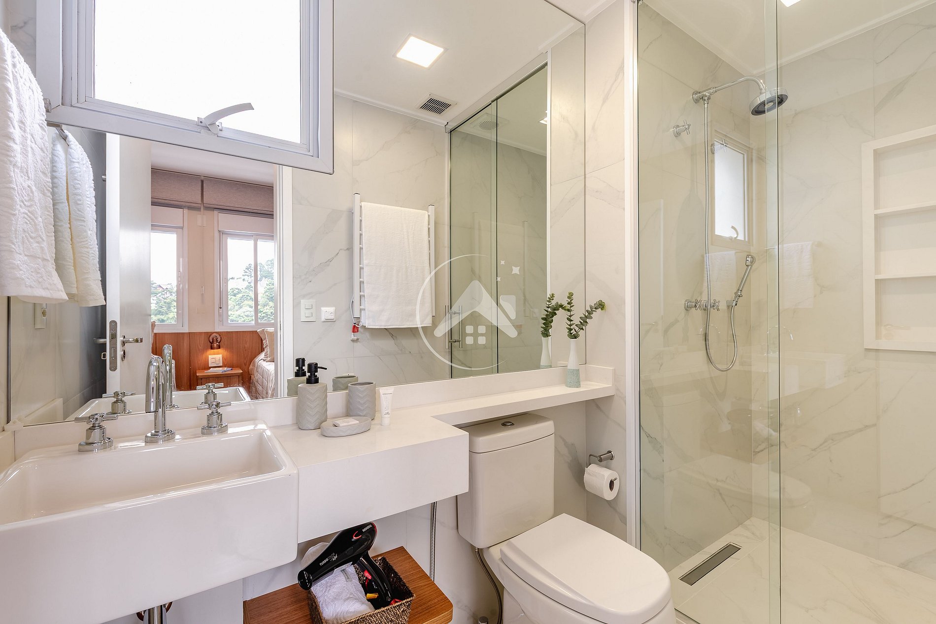 CONFORTO E CONVENIÊNCIA COM ENXOVAL COMPLETO, REDE E TOALHEIRO ELÉTRICO E PISO AQUECIDO NOS BANHEIROS: