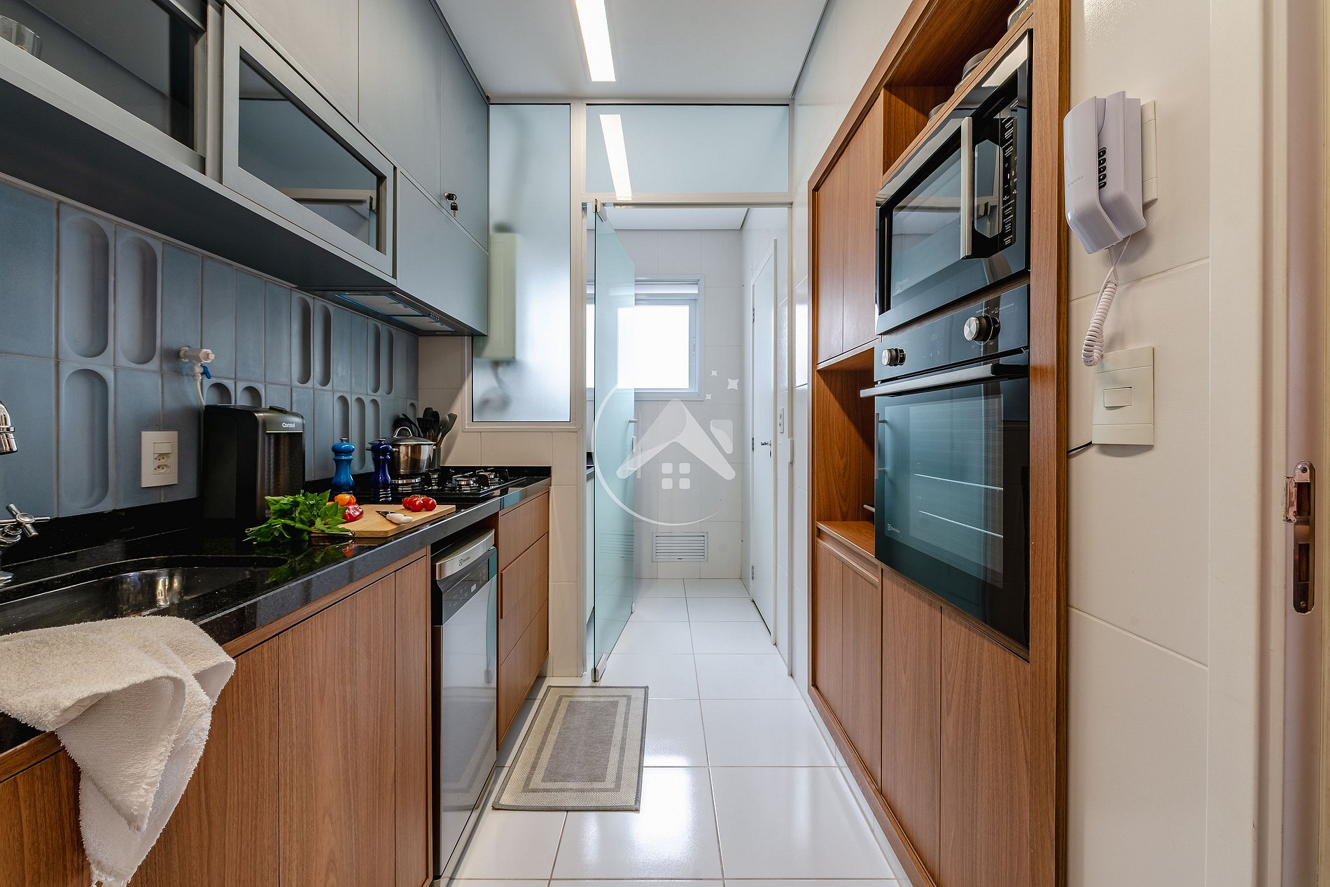Integrada à cozinha está a lavanderia, que dispõe de máquina lava e seca, varal, tábua de passar e ferro.