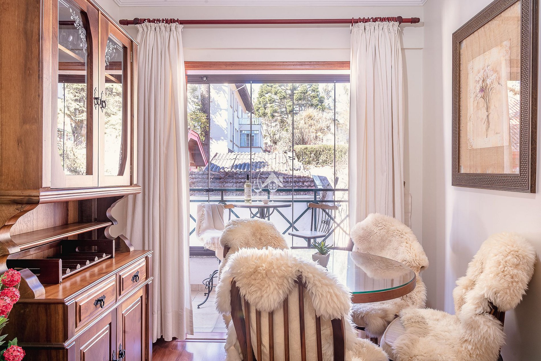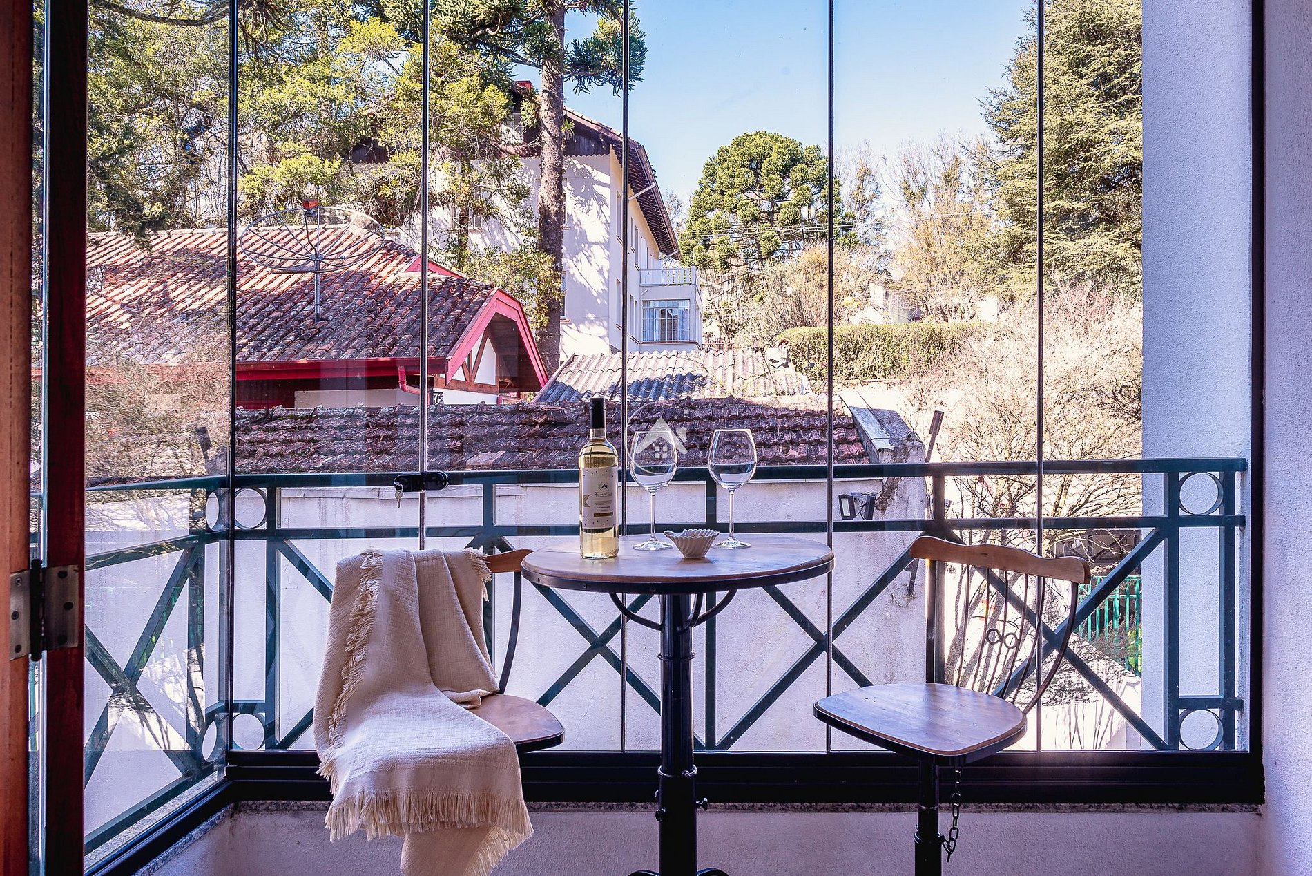 Agradável terraço, fechado com vidro, para apreciar um rótulo de vinho e uma boa conversa em ótima companhia.