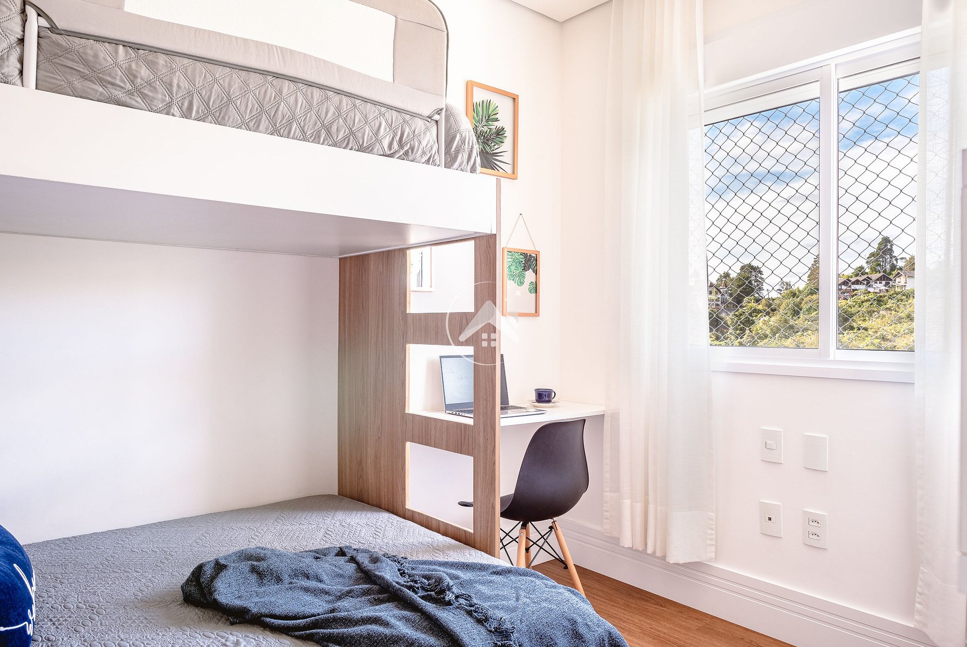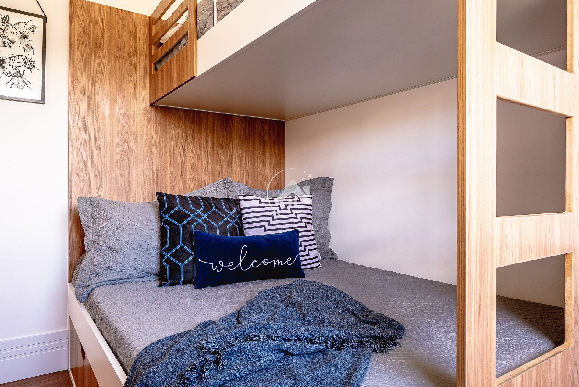- Quarto com beliche estilo americano, cama de casal na parte de baixo e solteiro em cima