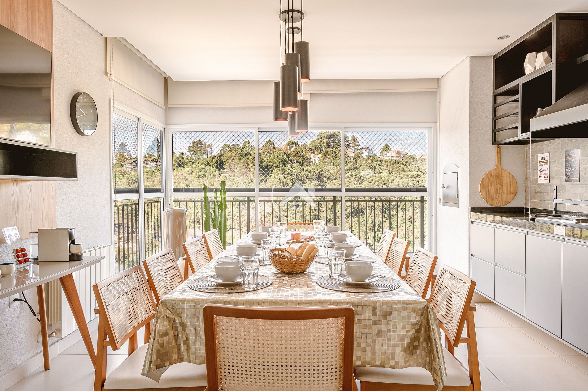 A varanda, com churrasqueira, forno de pizza e adega climatiza, tem uma vista agradável das montanhas e é o ambiente perfeito para saborear uma deliciosa refeição.