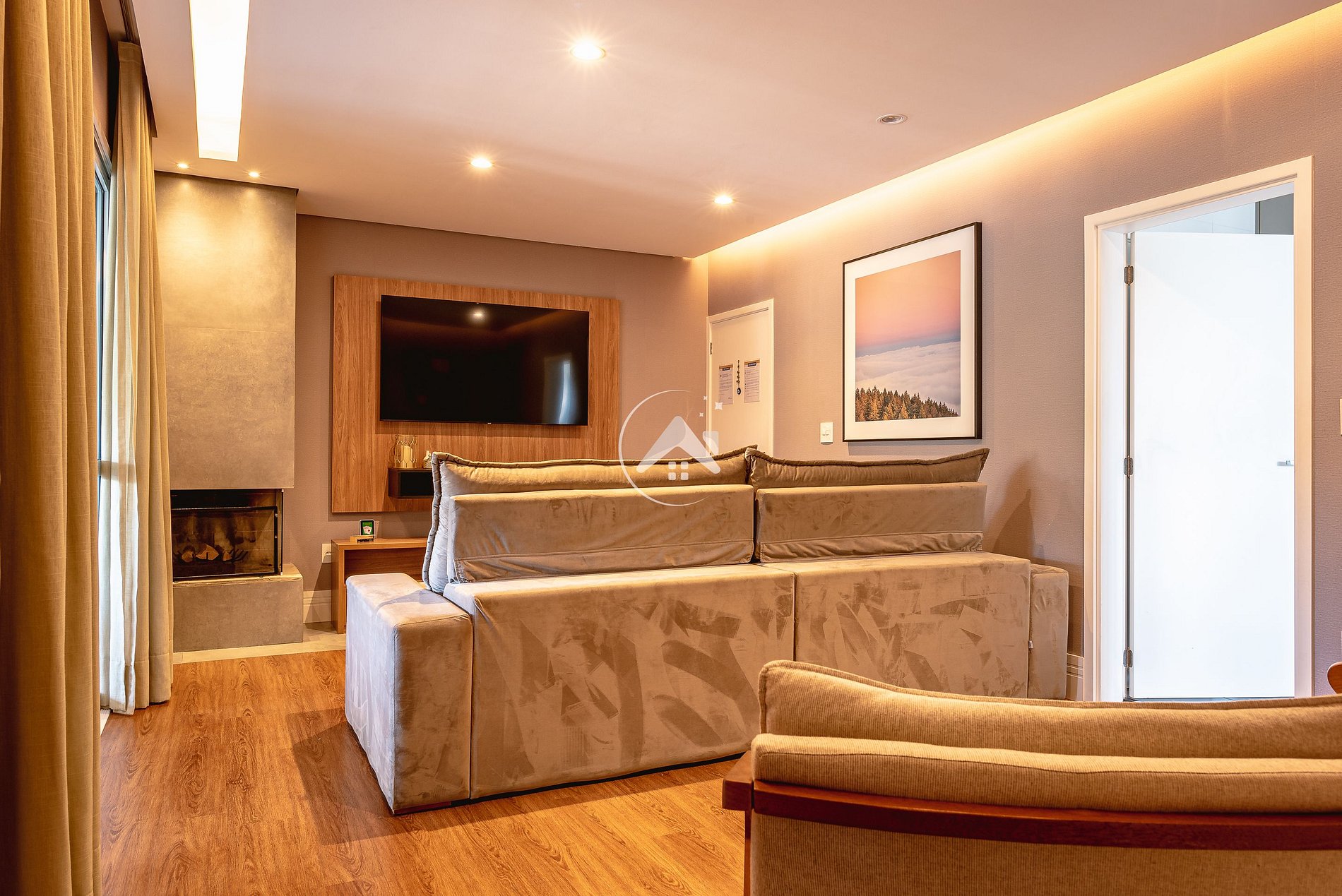SALA DE TV, COM ESPAÇO DE LEITURA, LAREIRA E SMART TV