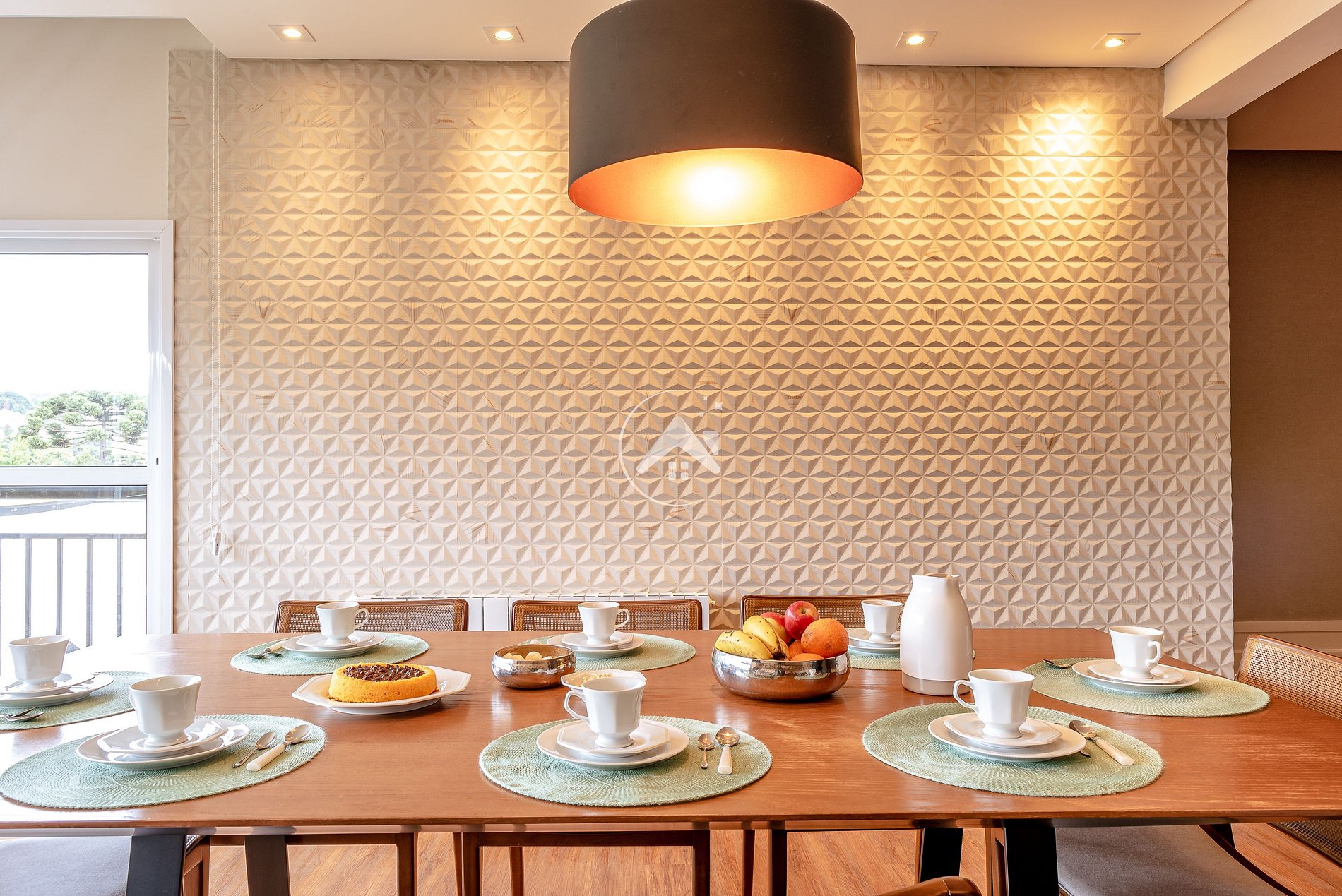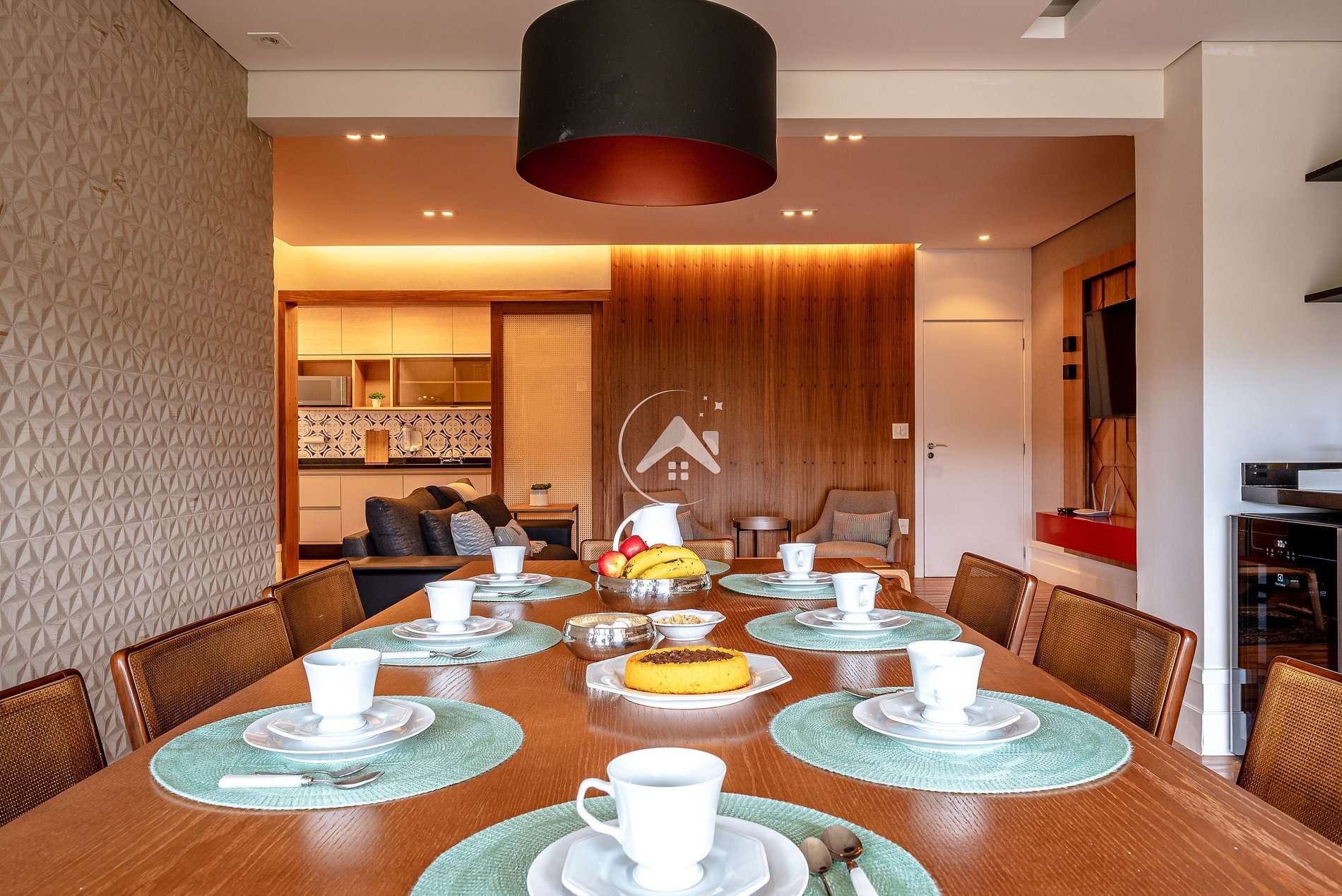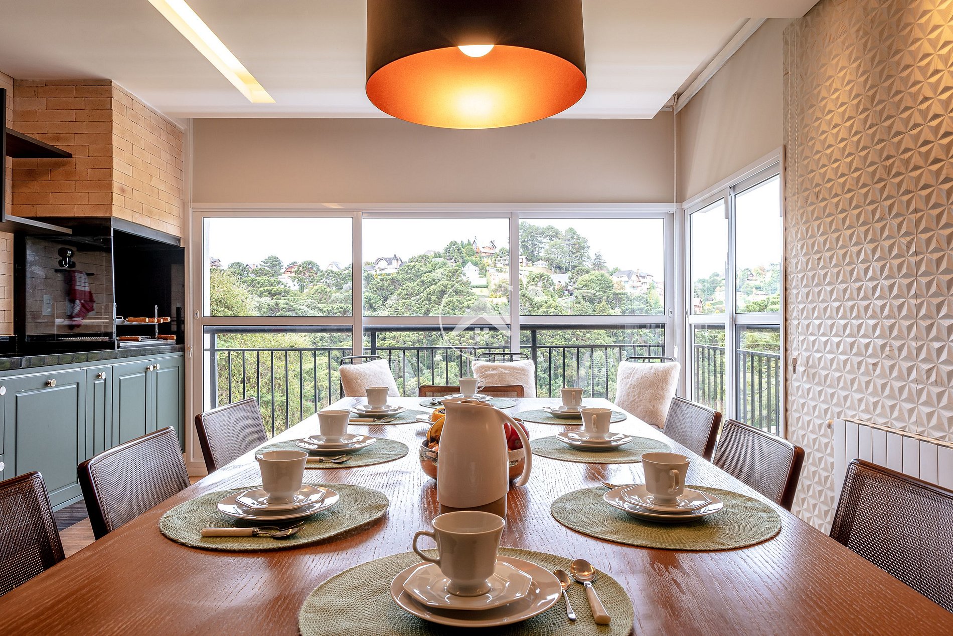 Sala de TV espaçosa e integrada à área gourmet, com Smart TV de 55'', lareira, cervejeira frostfree e mesa para refeições. Cantinho perfeito para reunir todos e jogar uma rodada de baralho ou apreciar um maravilhoso café da manhã. Melhor jeito de começar o dia! A vista para área verde e a churrasqueira complementam a experiência.