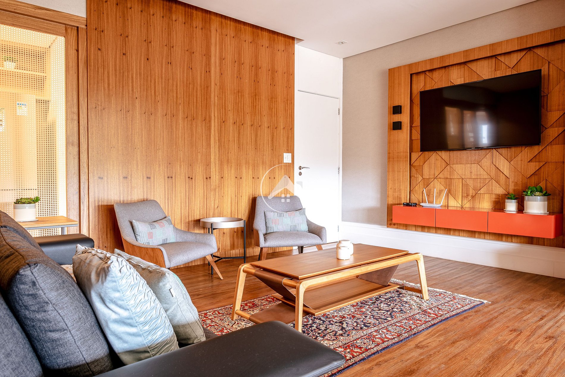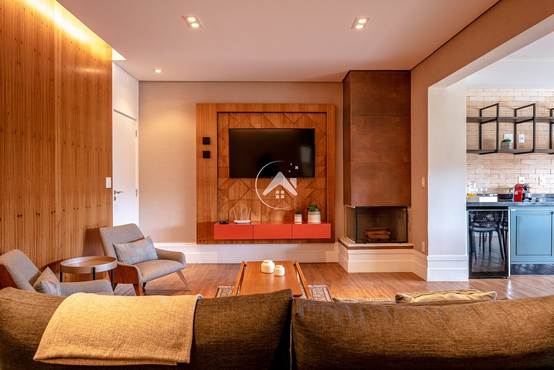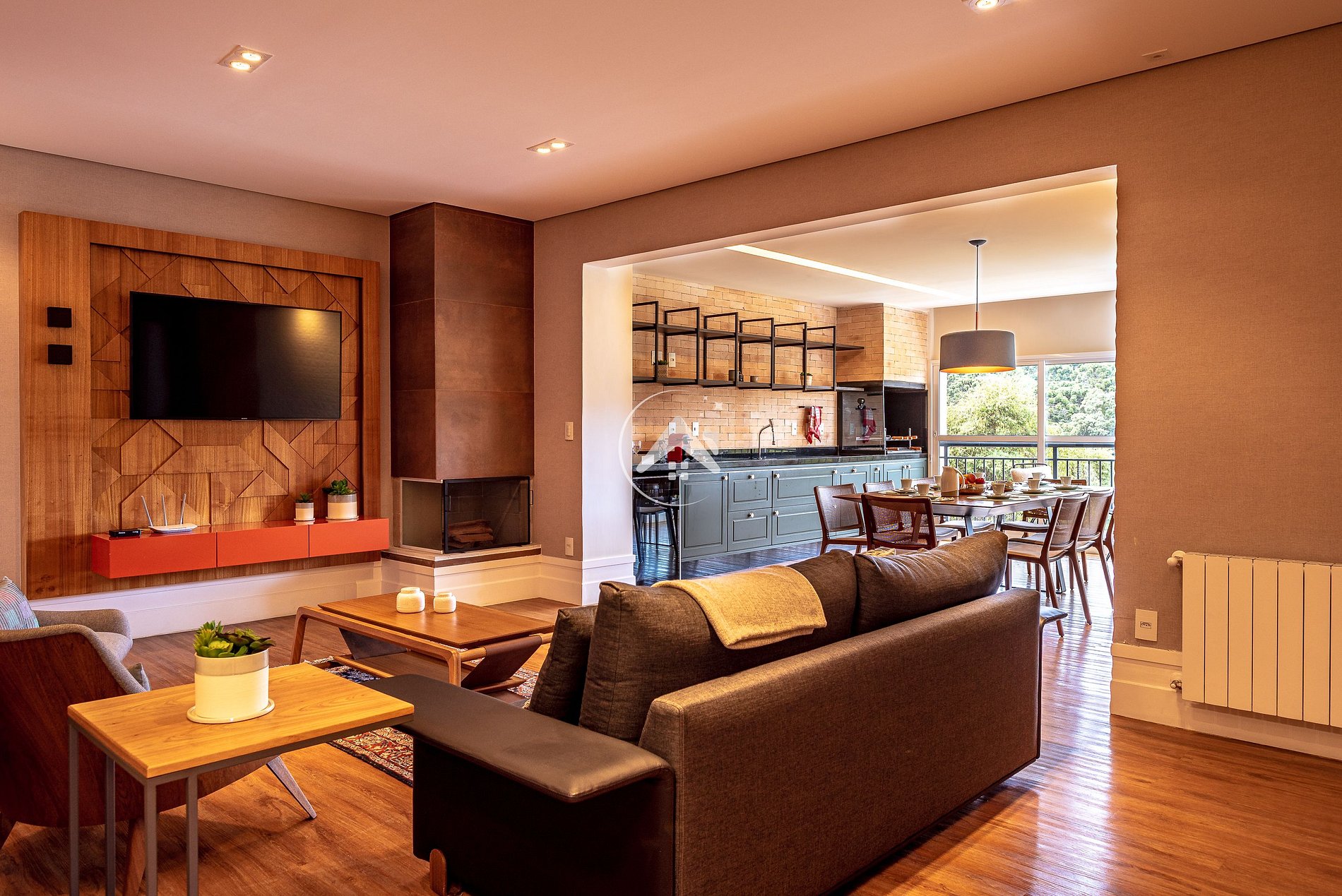 AMPLA SALA DE TV INTEGRADA À ÁREA GOURMET, COM LAREIRA E CHURRASQUEIRA