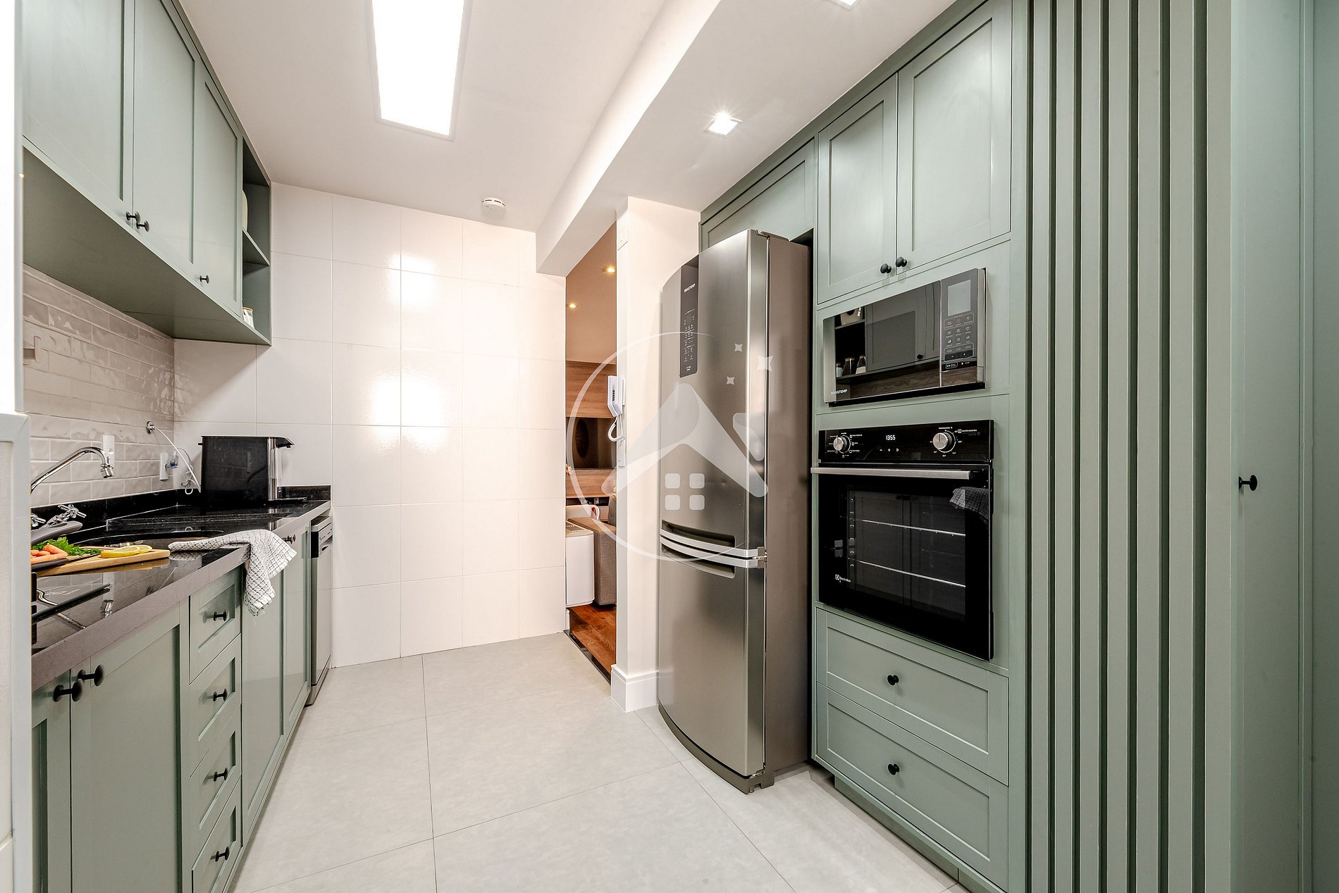 O espaço da cozinha é integrado à lavanderia, que conta com máquina lava e seca, varal, tábua de passar e ferro. Itens essenciais para garantir a tranquilidade que merece.