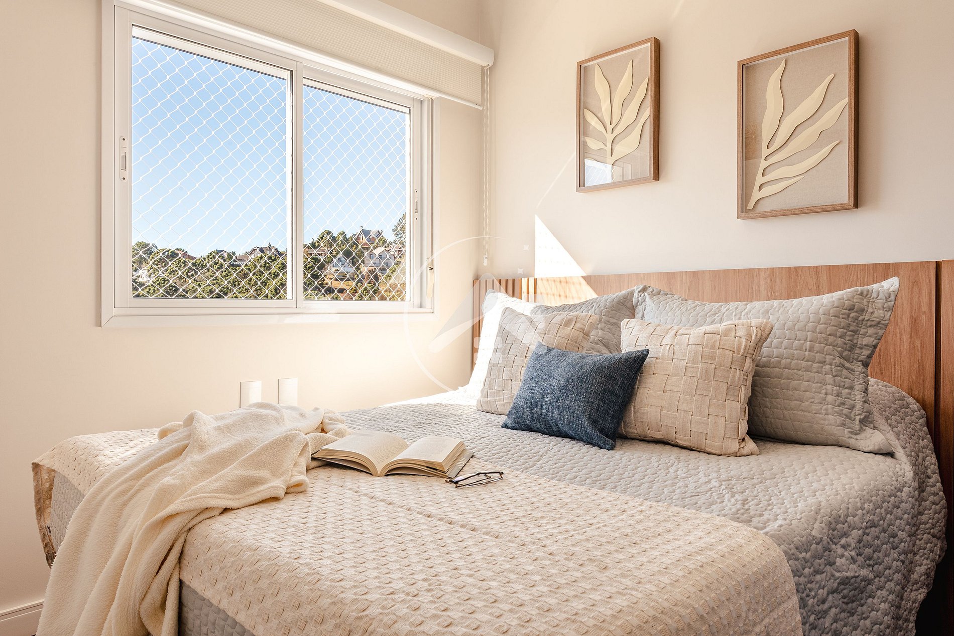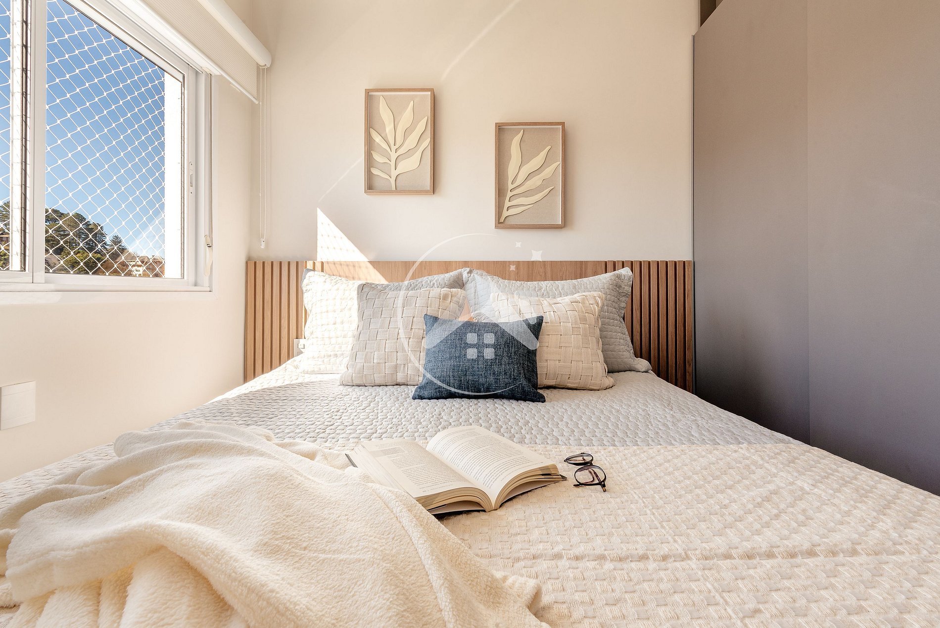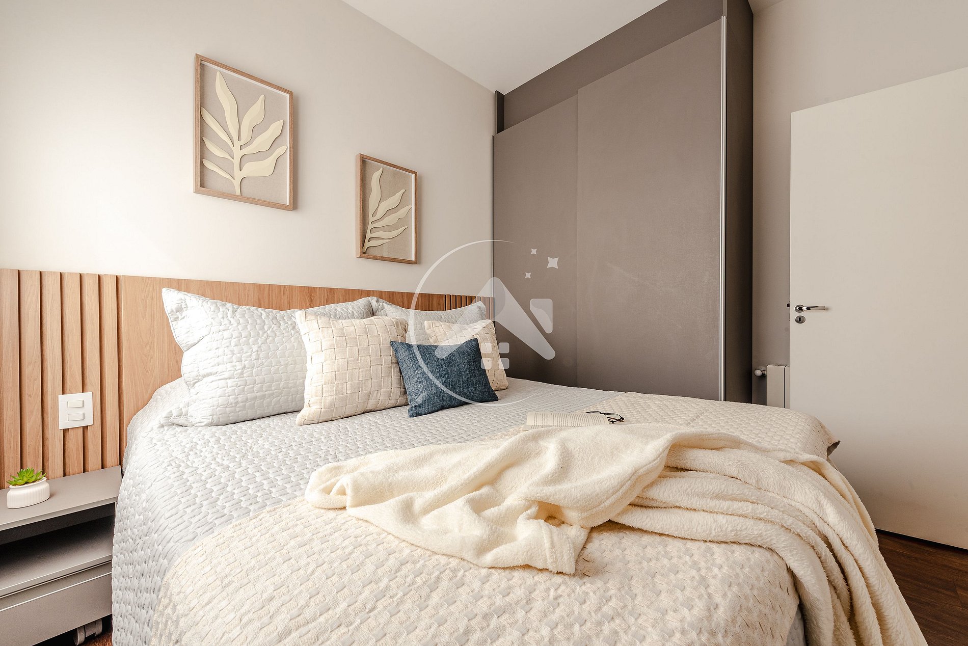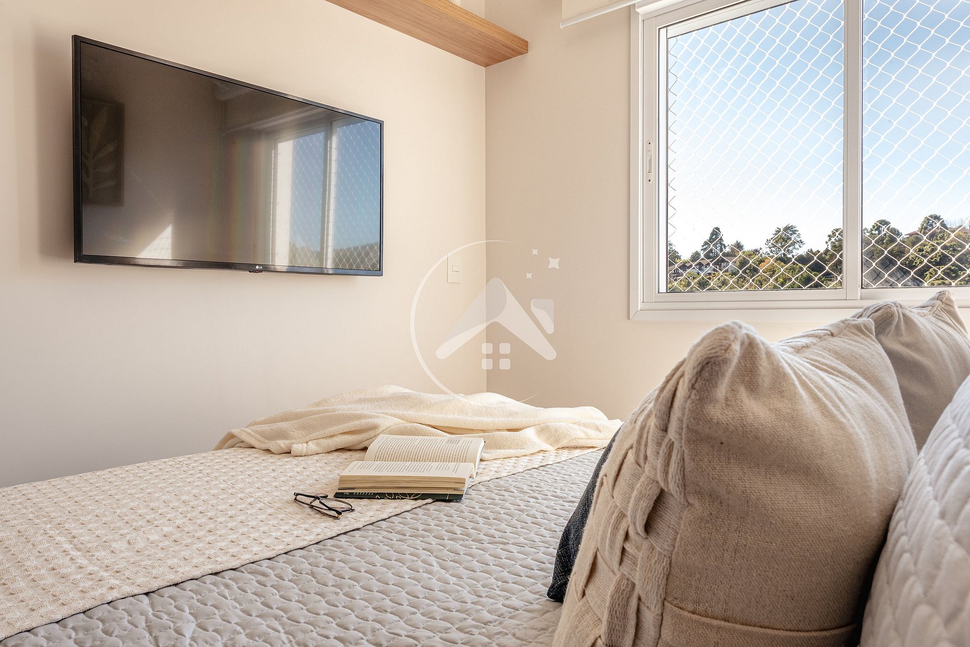 - Quarto com cama queen, Smart TV e armário;