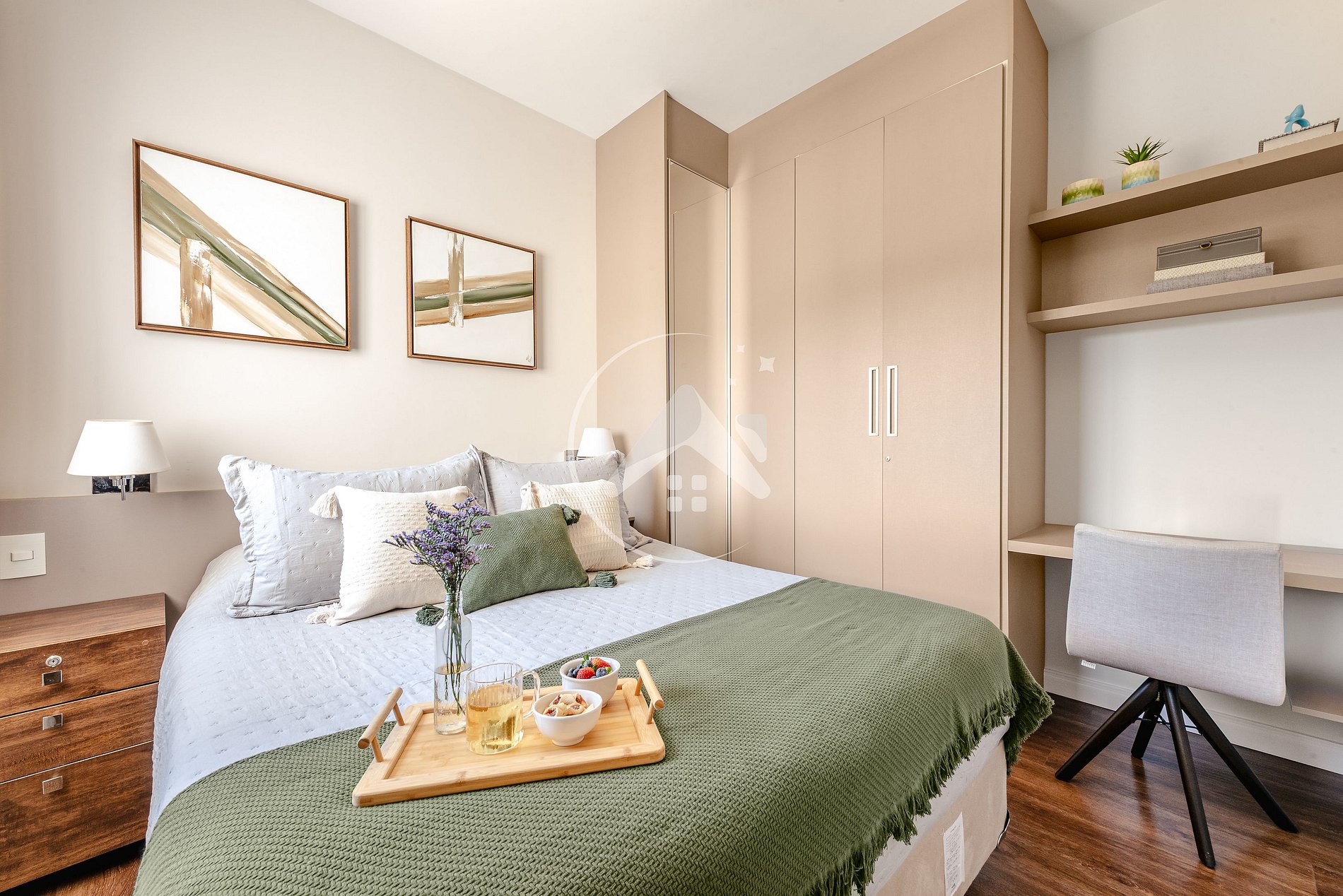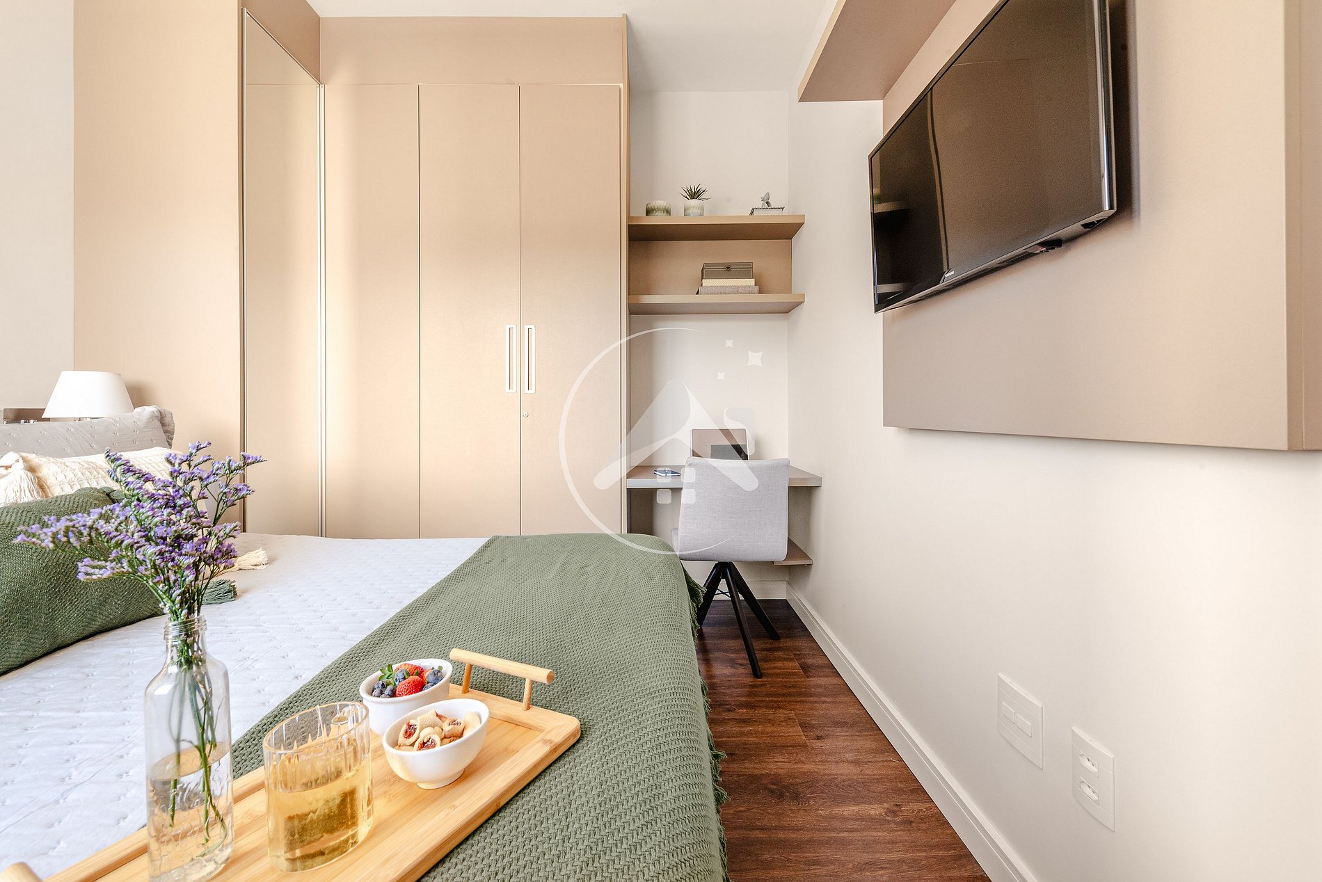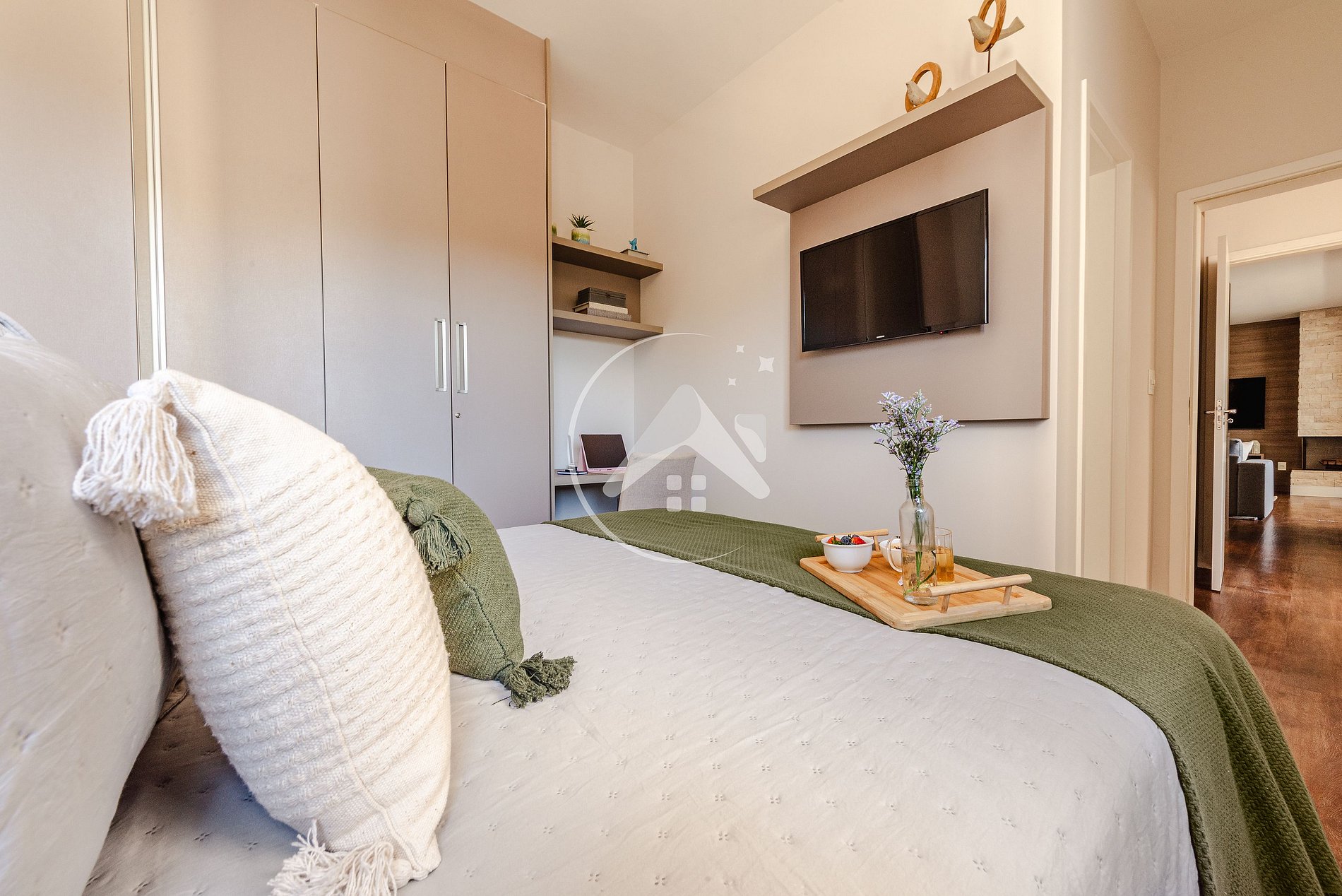 - Suíte com cama queen, Smart TV e armário - escrivaninha, com cadeira, para home office;