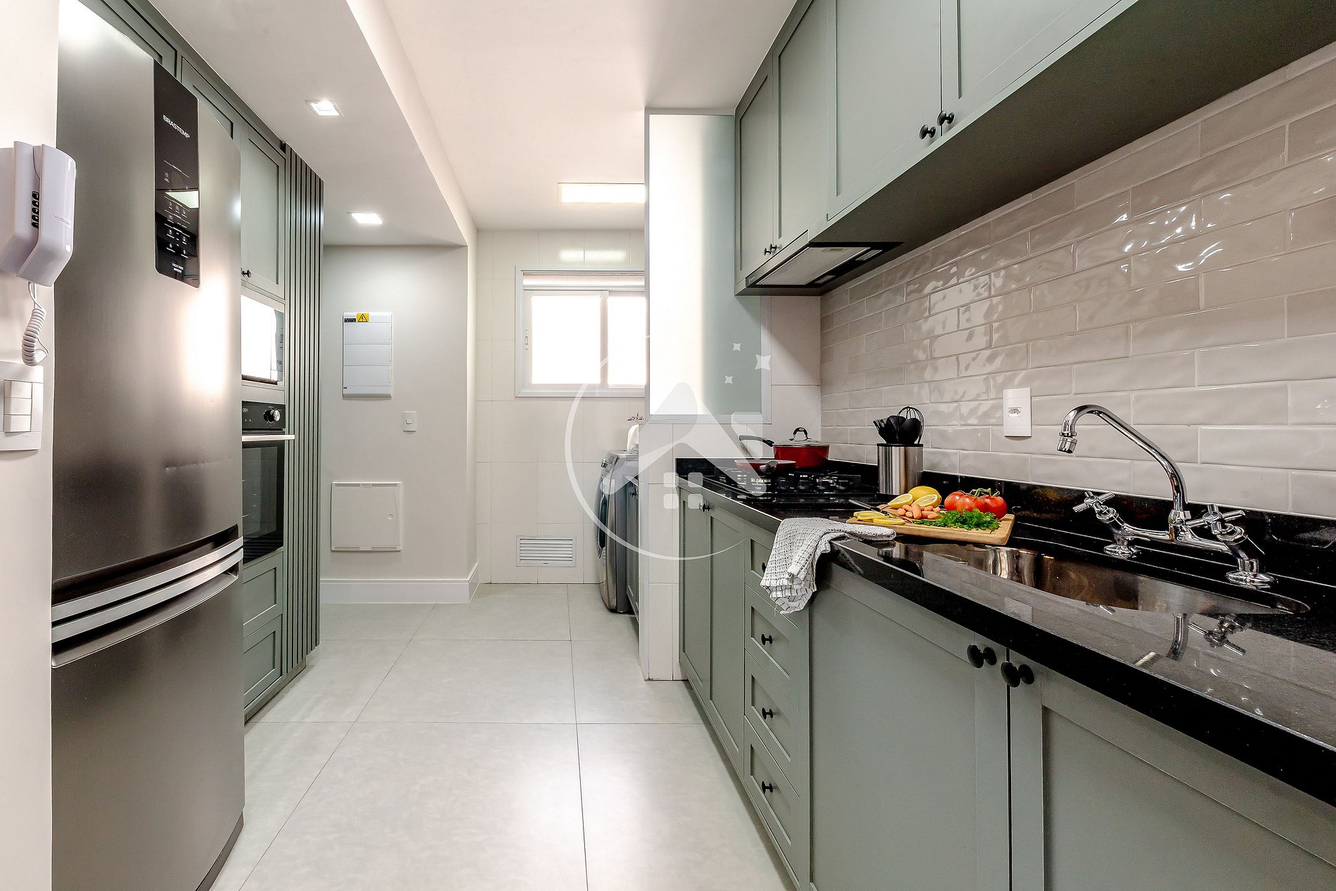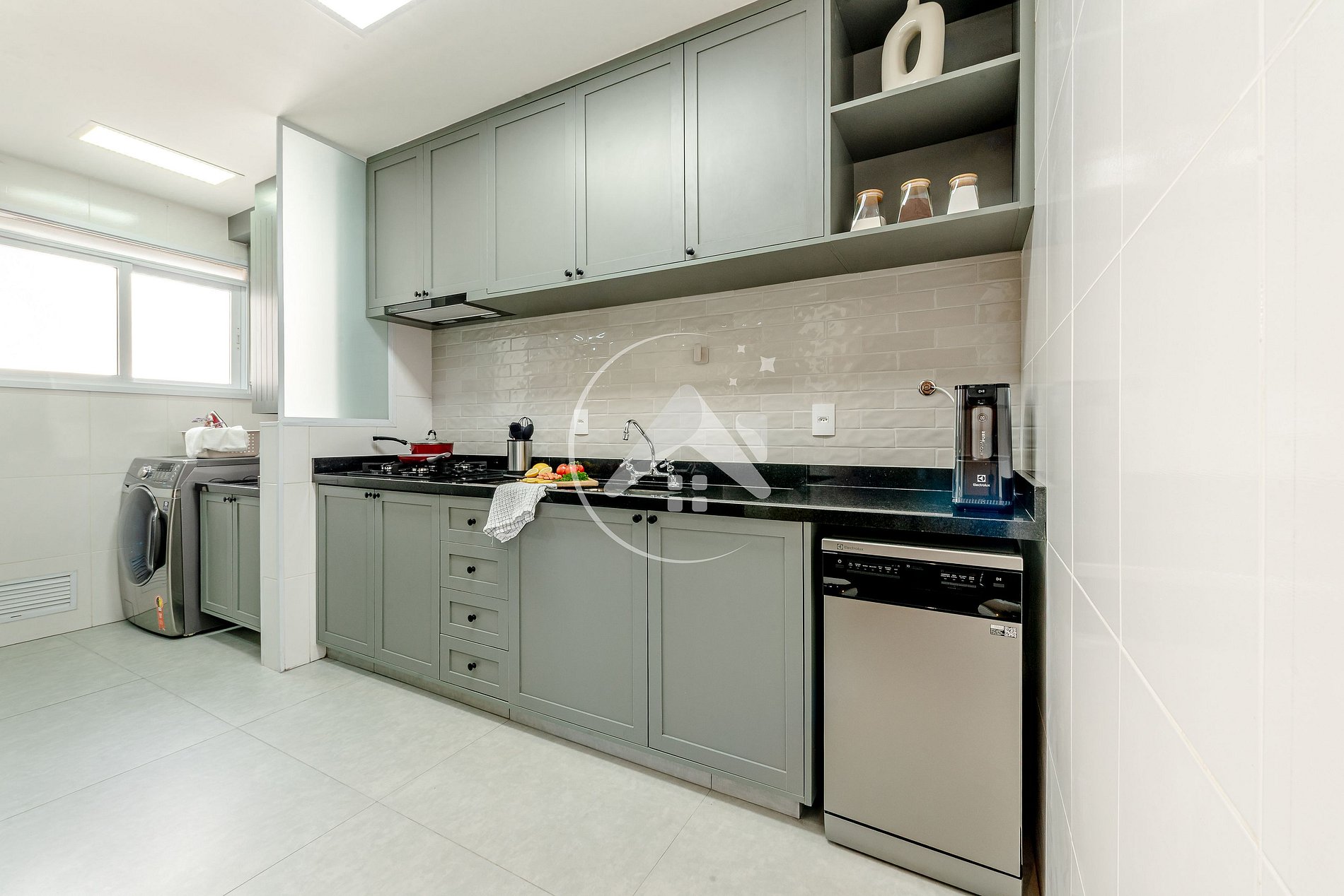 O espaço da cozinha é integrado à lavanderia, que conta com máquina lava e seca, varal, tábua de passar e ferro. Itens essenciais para garantir a tranquilidade que merece.