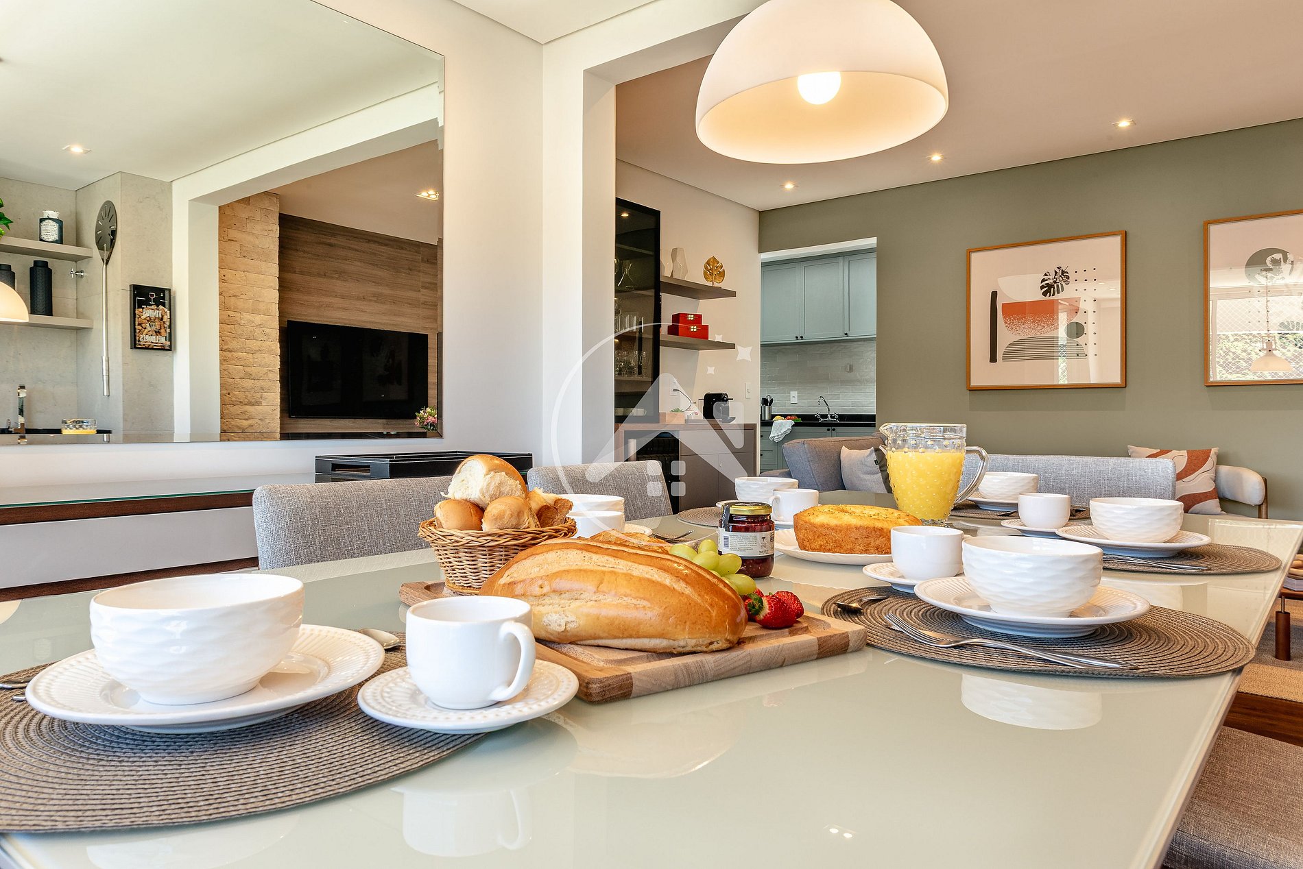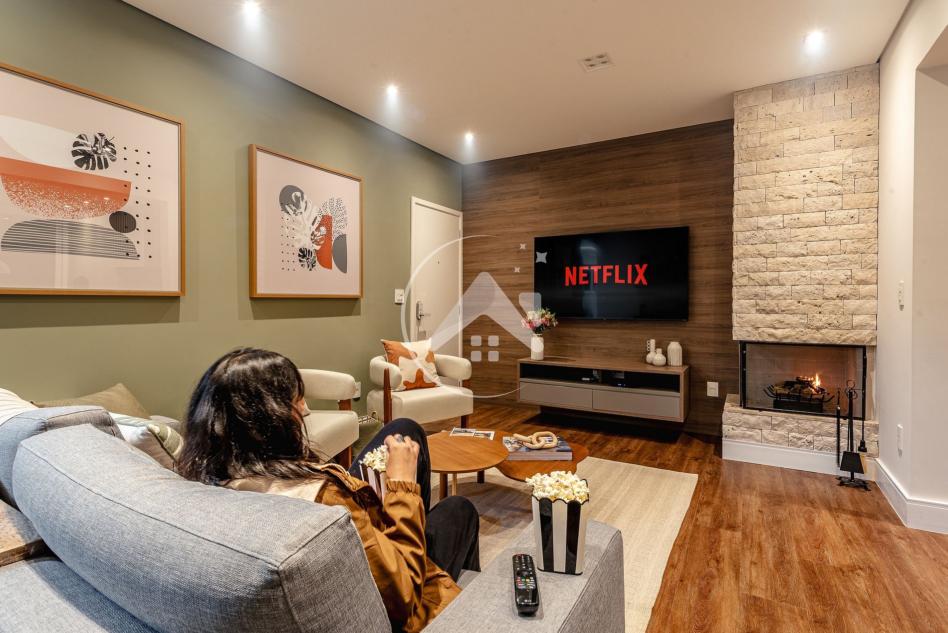 Ampla sala de TV com lareira, perfeita para relaxar nos dias frios. Integrada à área de refeições, conta ainda com churrasqueira e forno de pizza. Proporcionando um ambiente acolhedor e completo para reunir todos em torno de boas conversas e deliciosas refeições em família.
